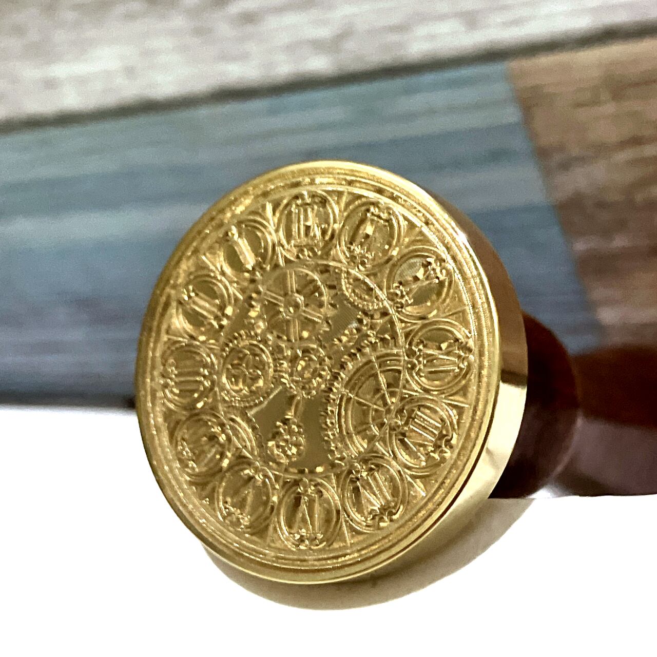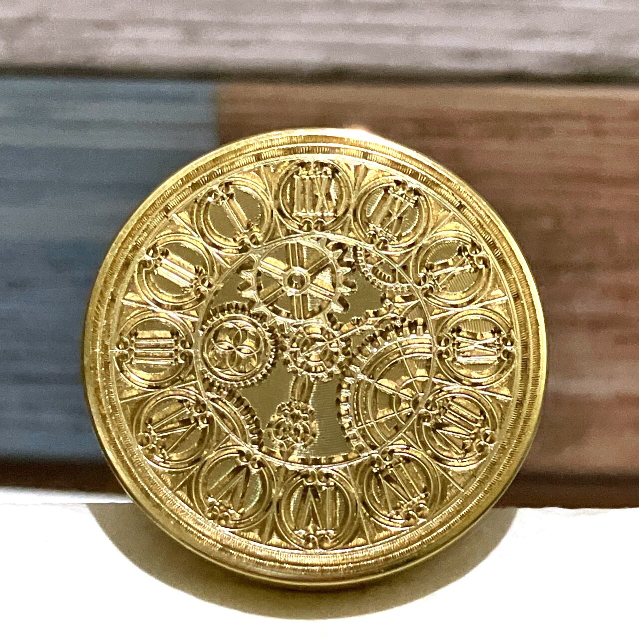 ローマ数字で描かれた時計盤の中心に歯車が描かれたデザインのスタンプヘッドです。