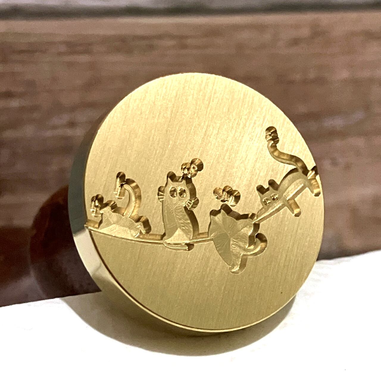 1本の紐の上を渡る4匹の猫が描かれたデザインのスタンプヘッドです。