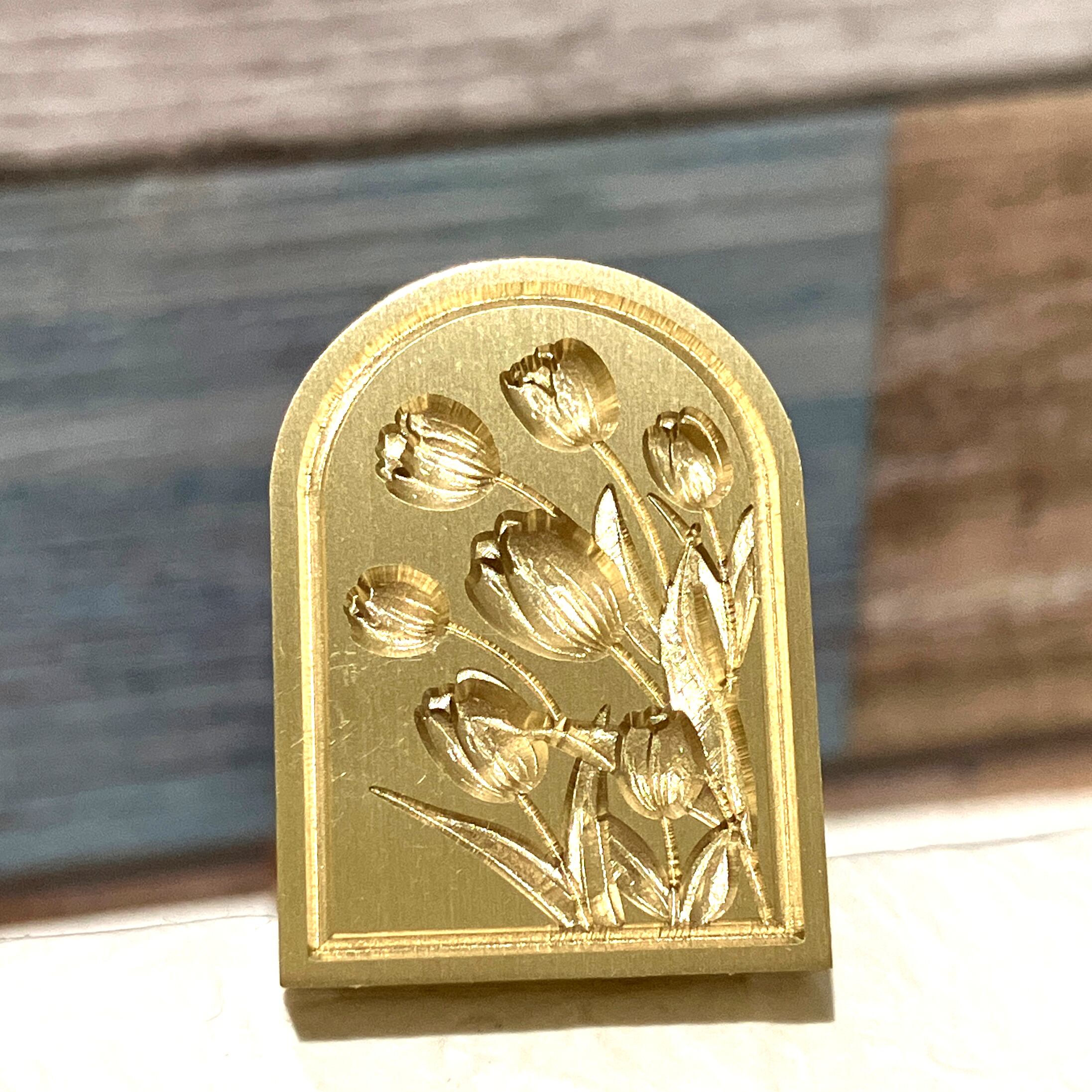 窓枠のような形の中にチューリップが咲いているデザインのスタンプヘッドです。